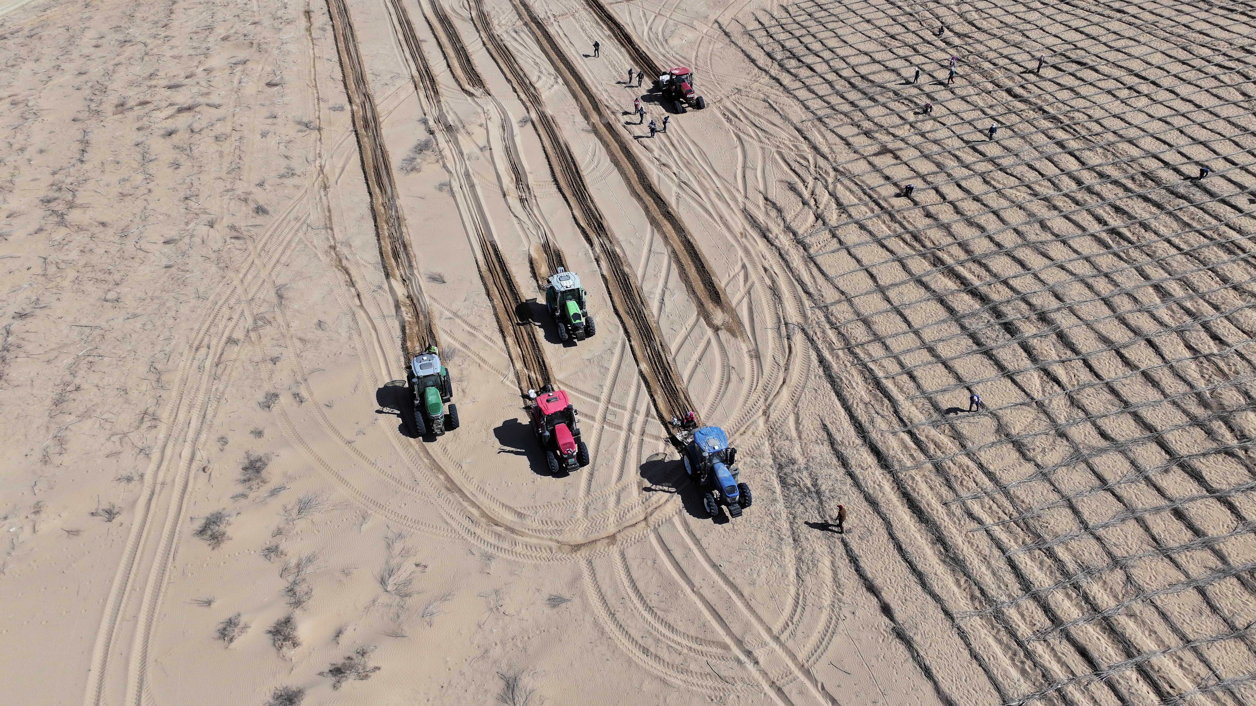 4月10日,在宁夏中卫市国有林业总场长流水管理站腾格里沙漠东南缘,治沙工人利用“刷状网绳式草方格沙障”固沙(无人机照片)。新华社记者杨植森 摄