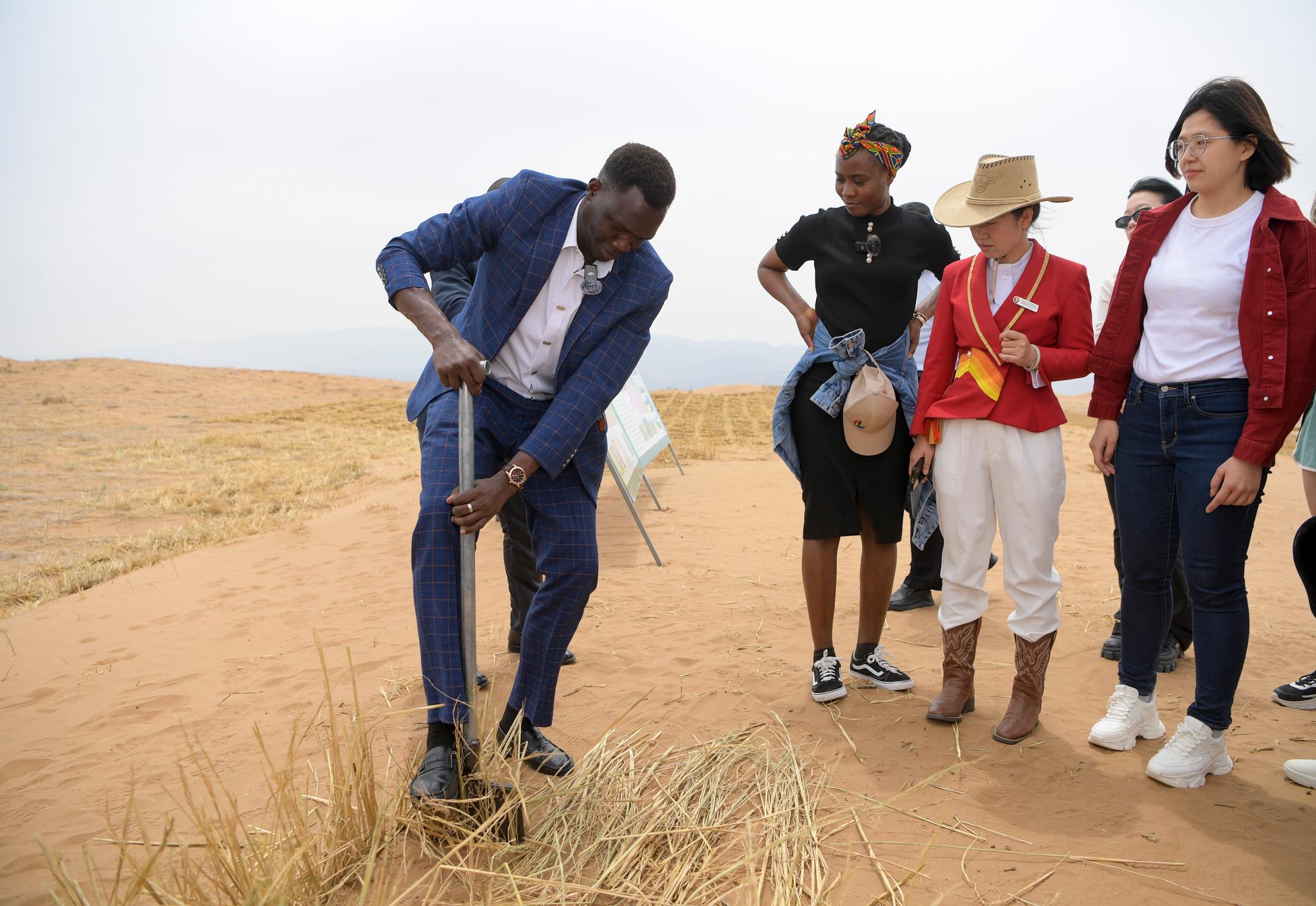 来自肯尼亚的北京大学南南学院在读博士麦克(左一)在腾格里沙漠体验扎草方格(2024年5月31日摄)。新华社记者冯开华 摄